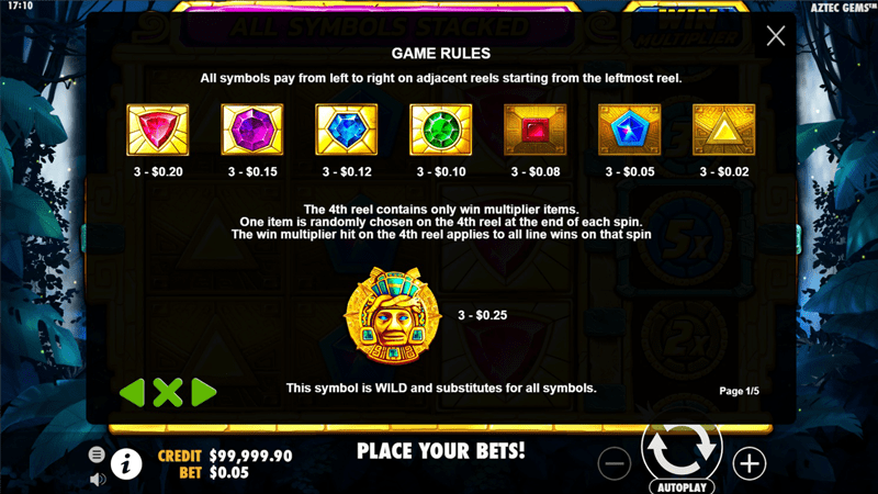 Aztec Gems เป็นวิดีโอสล็อต 3 วงล้อ 3 บรรทัดที่สามารถมอบรางวัลให้คุณถึง 375 เท่าของเงินเดิมพันทั้งหมด เกมสล็อตอันล้ำค่านี้มี 5 สายการจ่ายเงิน และวงล้อทวีคูณพิเศษที่จะช่วยเพิ่มรายได้ของคุณในเวลาไม่นาน Aztecs มุ่งมั่นที่จะมอบรางวัลให้คุณด้วยขุมทรัพย์ที่ใหญ่ที่สุด ผู้ชาย Aztec ตั้งค่าความผันผวนของเกมนี้ในระดับปานกลางในขณะ ที่ค่า RTP ตั้งไว้ที่ 96.53% ผู้สร้างเกมสล็อตนี้ได้วิเคราะห์แต่ละสัญลักษณ์ก่อนรวมมันไว้ในรายการสัญลักษณ์เหล่านี้ไว้แล้ว: