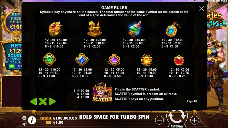 สล็อตออนไลน์ที่ดำเนินไปอย่างรวดเร็ว นี้มีอัตรา RTP ที่หลากหลาย แต่เวอร์ชันที่พบบ่อยที่สุด มีค่าสัมประสิทธิ์ 96.50% มันสอดคล้องอย่างสมบูรณ์แบบกับระดับความผันผวนที่สูงมาก อย่าลืม RTP ของชื่อบนเว็บไซต์คาสิโนที่คุณชื่นชอบ! ช่วงการเดิมพัน Gates of Gatot Kaca ค่อนข้างกว้าง และผู้เล่นสามารถปรับขนาดและจำนวนเหรียญได้เงินเดิมพันอาจมีตั้งแต่ 0.20 ถึง 100 ปอนด์ ต่อการหมุนหนึ่งครั้ง ยิ่งไปกว่านั้น ฟีเจอร์ Ante Bet ยังช่วยให้คุณเพิ่มเดิมพันของคุณได้ 25% และในทางกลับกัน จะเพิ่มโอกาสที่สแกตเตอร์จะชนกระดานเป็นสองเท่า คุณลักษณะนี้จะไม่เปลี่ยนขนาดของการจ่ายเงิน! เกมดัง กล่าวไม่มีสัญลักษณ์เสริมแต่มีการติดตั้ง Tumbling Reels หลังจากการชนะแต่ละครั้ง สัญลักษณ์จะหายไป ส่วนที่เหลือจะตกลงไปด้านล่าง และสัญลักษณ์ใหม่จะมาจากด้านบน ฟีเจอร์ Tumble นั้นไม่จำกัดระยะเวลา และตัวคูณแบบสุ่มสามารถ เพิ่มการจ่ายเงินทั้งหมดจาก x2 เป็น x500 ปรากฏอยู่ในรูปของลูกแก้วพลังงานสีเขียว สีเหลือง สีม่วง และสีแดง Gatot Kaca เป็นสัญลักษณ์กระจายและมีกำไรมากที่สุดบนตาราง โดยจ่าย x3, x5 และ x100 สำหรับการแข่งขัน 4 ถึง 6 นัด ขนาดกลุ่มจะกำหนดการจ่ายเงินอื่นๆ ทั้งหมด - 8-9, 10-11 หรือ 12-30 แหวนทับทิมทอง และรูปปั้นสิงโตทอง จ่ายมากที่สุด - x50 และ x25 Green Potion และ Blue Compass ตามมาด้วยการจ่ายเงิน สูงสุด x15 และ x12 อัญมณีหลากสีมอบเงินรางวัลเล็กๆ น้อยๆ เป็นประจำ!