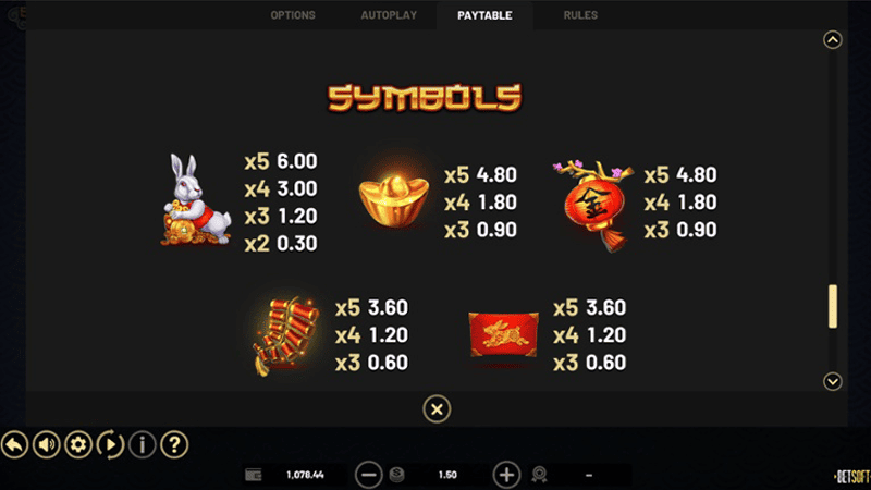 มีสัญลักษณ์การจ่ายมากถึง 11 สัญลักษณ์ในเกม และคุณสามารถตั้งตารอ สัญลักษณ์การจ่ายต่ำ 6 อันและสัญลักษณ์การจ่ายสูง 5 อัน สัญลักษณ์ที่จ่ายต่ำของสล็อตจะแสดงอันดับไพ่คลาสสิกของคุณ และพวกมันสามารถทำให้คุณได้รับเงินเดิมพันสูงถึง 1.2 เท่าสำหรับไพ่ห้าใบ จากนั้นมีสัญลักษณ์เฉพาะเรื่อง ได้แก่ ซองจดหมาย ประทัด ตะเกียง พระเครื่องทองคำ และกระต่าย กระต่ายมีค่ามากที่สุด และพวกมันจะจ่ายรางวัลแม้จะเป็นชุดสัญลักษณ์เพียงสองสัญลักษณ์ก็ตาม อย่างไรก็ตาม รับ 5 และคุณจะได้รับการจ่ายเงิน 4เท่า นั่นอาจดูไม่มาก แต่จำไว้ว่า มีมากถึง 1,024 วิธีที่จะชนะที่นี่!ในแง่ของสัญลักษณ์พิเศษ มีการผสมผสานระหว่าง Wave Wilds และ Coin Scatters ตามปกติของคุณ Wave Wilds สามารถใช้แทนสัญลักษณ์การจ่ายใดๆ ได้ แต่จะปรากฏบนวงล้อกลางสามวงเท่านั้น ในขณะเดียวกัน Coin Scatters คือตั๋วของคุณไปสู่ฟีเจอร์ฟรีสปิน
