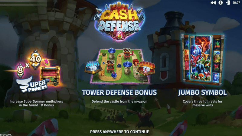 Cash Defense เป็นเดมสล็อตที่ มี 5 รีล และมี 4 แถว มาพร้อมฟีเจอร์ Mini TD และฟีเจอร์ Grand TD Bonus หากสัญลักษณ์ Mini TD ปรากฎในรีลที่ 5 จะเข้าสู่ฟีเจอร์ Mini TD เกมจะมีหอคอยให้คุณ 2 หอคอย สัญลักษณ์ 10 สัญลักษณ์ และศัตรูโบนัส 1 ตัว คุณต้องกำจัดศัตรู เพื่อรับโบนัสจากฟีเจอร์นี้ไป คุณจะเข้า ฟีเจอร์ Grand TD Bonus ของเกม Cash Defense สัญลักษณ์ Bonus ปรากฎบนกระดาน 3 สัญลักษณ์  ในฟีเจอร์ Grand TD Bonus คุณจะมีหอคอย ไว้กำจัดศัตรู และศัตรูจะมา 2 รอบ รอบแรกจะมีศัตรู 10 สัญลักษณ์ ต้องกำจัดอย่างน้อย 5 สัญลักษณ์ เพื่อเปิดใช้งานรอบที่ 2 และรอบที่ 2 จะมีศัตรูทั้งหมด 50 สัญลักษณ์