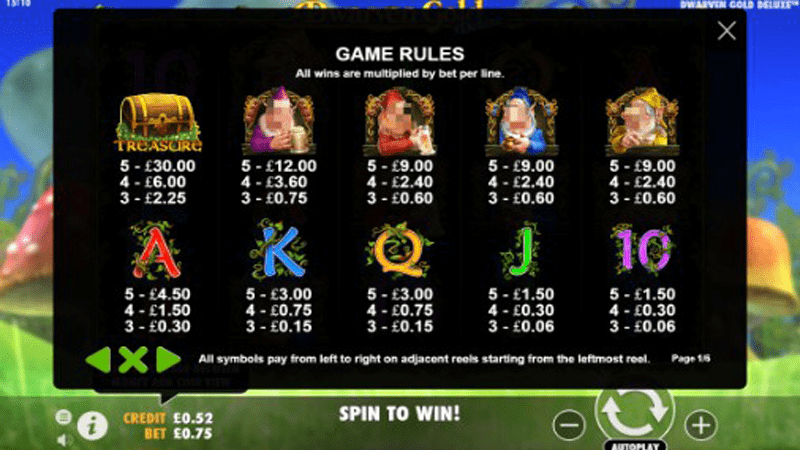 Dwarven Gold เป็นวิดีโอสล็อตที่มีมนต์ขลังที่เล่นบน ตาราง 5×3 โดยมีสัญลักษณ์ 12 ตัวที่ตีวงล้อ คนแคระติดตั้งสล็อต 25 ช่องจ่ายเงินและ RTP 96.64% Nibbles, Gibbles, Fillydook และ Fenthwick เป็นส่วนหนึ่งของการเล่นเกมและพร้อมกับหีบสมบัติทำหน้าที่เป็นสัญลักษณ์ที่จ่ายเงินสูงของสล็อตออนไลน์นี้ ไพ่ยังปรากฏบนหน้าจอเป็นสัญลักษณ์ที่จ่ายน้อย
