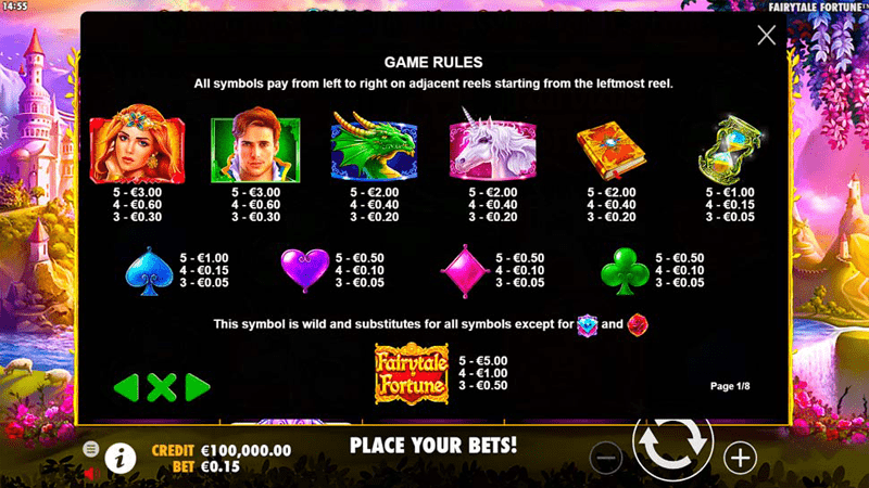 Fairytale Fortune มี 5 วงล้อ 3 แถว และช่องจ่ายเงินคงที่ 15 ช่อง เกมนี้มีตัวเลือกการเดิมพันที่หลากหลายซึ่งเหมาะสำหรับผู้เล่นทุกประเภท เดิมพันขั้นต่ำเพียง 0.15 ยูโร แต่ถ้าคุณเล่นเหรียญต่อแถวและมูลค่าของมันสักหน่อย คุณสามารถเล่นได้ด้วยเงิน เดิมพันสูงสุดที่ 75 ยูโร เช่นเดียวกับสล็อตอื่นๆ ขนาดการเดิมพันจะสะท้อนให้เห็นในจำนวนเงินที่ชนะ กล่าวอีกนัยหนึ่ง หากคุณต้องการได้รับชัยชนะที่มากขึ้น คุณควรเลือกเดิมพันที่สูงกว่า สล็อตร่วมสมัยส่วนใหญ่ มีอัตรา RTP ในช่วง 96–98% หากคุณคาดหวังอัตราส่วนผลตอบแทนต่อผู้เล่นในช่วงนั้น Fairytale Fortune ที่มี 96.52% จะไม่ทำให้คุณผิดหวังอย่างแน่นอน อย่างไรก็ตาม Fairytale Fortune เป็นสล็อตที่มีความผันผวนสูง ซึ่งหมายความว่าเดดสปินจะเกิดขึ้นค่อนข้างบ่อย ความผันผวนที่จับคู่กับอัตราผลตอบแทนของผู้เล่นทำให้ Fairytale Fortune เป็นสล็อตที่สมดุลอย่างสมบูรณ์แบบ ผู้เล่นจะได้รับความบันเทิงจากการเล่นเกมแบบไดนามิก และไม่น่าเป็นไปได้ที่เซสชั่นนี้จะทำให้พวกเขามือเปล่า