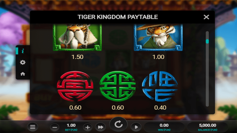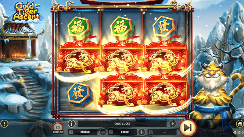 เสือกังฟูสายสีน้ำเงินนั่งขัดสมาธิทางด้านขวามือของตาราง 3x3 ที่ไหนสักแห่งในเทือกเขาหิมาลัย เขาดูเหมือนคนที่ค้นพบความลับของจักรวาล แต่จะไม่มีวันเปิดเผยมันให้คนที่ไม่ได้ฝึกหัดรู้จัก คุณจะต้องขึ้นไปบนยอดเขาเพื่อค้นหาโดโจ/วัดของเขา แต่แมวเจ้าเล่ห์อาจจะหนีขึ้นสู่สวรรค์ได้ เช่นเดียวกับที่เขาทำเมื่อรอบโบนัสเริ่มทำงานอย่างไรก็ตาม Gold Tiger Ascent นั้นเป็นรุ่นที่เรียบง่ายของ Betsoft และมันหมุนรอบฟีเจอร์ สัญลักษณ์ลึกลับ Magic Red Envelope มันจะทำให้เกมหลักมีชีวิตชีวาขึ้นเป็นครั้งคราว โดยให้รางวัลสัญลักษณ์พรีเมี่ยมที่ตรงกัน ไวด์ รางวัลทันที หรือสแกตเตอร์ อย่างไรก็ตาม ไม่สามารถชนะรางวัลใหญ่ได้จากการหมุนเพียงครั้งเดียว แต่สามารถรับเงิน เดิมพันรวม2,520 เท่า จากรอบโบนัสที่มาพร้อมกับสัญลักษณ์ลึกลับ Magic Red Envelope ในทุกการหมุน