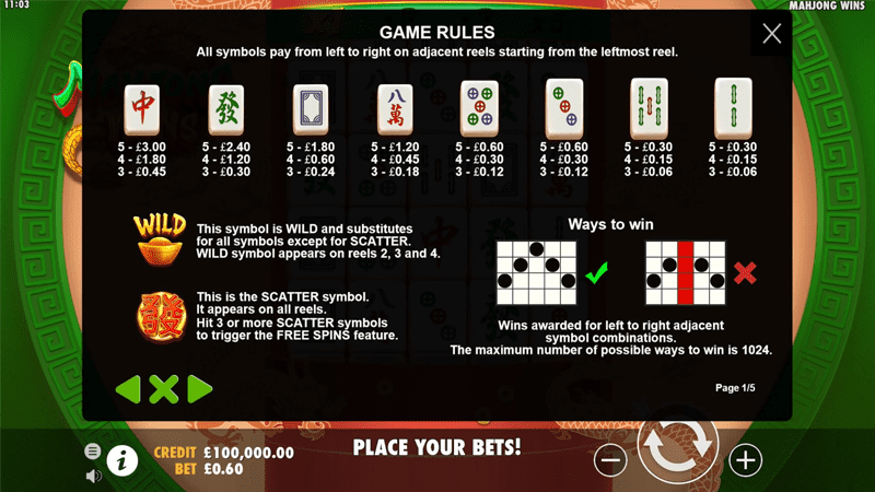 ยกเกมไพ่นกกระจอก มาให้คุณได้เล่นอย่างง่ายดาย ในรูปแบบ เกมสล็อต Mahjong Wins ที่ให้คุณได้ลุ้นตัวอักษรไพ่ไปด้วยกันบนกระดาน กงล้อขนาด 5×4 รีล และมีสัญลักษณ์พื้นฐานทั้งหมด 8 ตัว เป็นชุดไพ่นกกระจอกที่คุณคุ้นเคยโดยมีสัญลักษณ์ไพ่ทองคำที่เมื่อกระดานรอบนั้นชนะ สัญลักษณ์นี้จะเปลี่ยนเป็น สัญลักษณ์ Wilds ในรอบถัดไป สัญลักษณ์ Wild สามารถใช้แทนทุกสัญลักษณ์ยกเว้นเฉพาะ สัญลักษณ์ Scatter เท่านั้น และบนกระดานพื้นฐานจะได้รับตัวคูณต่อรอบ เริ่มที่ x1,x2,x3,x5 แต่ถ้าหากอยู่ในรอบฟรีสปินตัวคูณ จะเริ่มที่ x2,x4,x6,x10 ฟีเจอร์การทำงานทั้งหมดจะทำงานแบบวนซ้ำไปจนกว่าจะจบรอบ ผู้เล่นสามารถทำกำไร สูงสุดที่ 5,000x ของเงินเดิมพัน เกมนี้ไม่สามารถซื้อฟรีสปินได้