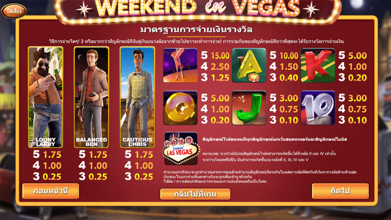 รีวิวเกมสล็อต Weekend In Vegas ค่าย BETSOFT WEEKEND IN VEGAS มีตัวละครที่น่าจดจำ 3 ตัวที่มุ่งหน้าไปยังเมืองหลวงแห่งโอกาสครั้งที่สองเพื่อโอกาสที่จะชนะรางวัลใหญ่ ชายหนุ่มผู้เคราะห์ร้ายเหล่านี้ปรากฏตัวอย่างแข็งแกร่งบนวงล้อและในรอบโบนัส โดยที่แต่ละคนมีสไตล์การเล่นเป็นของตัวเอง – มีความเสี่ยงสูง สมดุล และระมัดระวัง องค์ประกอบโบนัสอื่นๆ ได้แก่ Scatter Pays มากมาย Money Wheel ที่น่าตื่นเต้น และ Wilds ที่เสนอตัวคูณสูงถึง 2 เท่าเมื่อชนะ
