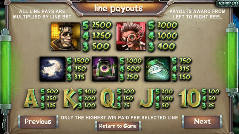 รีวิวเกมสล็อตมหาสนุก Frankenslot's Monster ค่าย BETSOFT ฉากหลังของเกมนั้นยอดเยี่ยมมาก มีห้องทดลองสไตล์โกธิคสไตล์วิคตอเรียนเต็มรูปแบบที่เต็มไปด้วยของกระจุกกระจิกที่คุณจะเชื่อมโยงกับการทดลองของนักวิทยาศาสตร์ผู้บ้าคลั่ง กำแพงอิฐสีเทาและเสาโค้งปะทะกันอย่างยอดเยี่ยมกับสายไฟหนักของทรงกลมแก้วที่เดือดปุด ๆ และหน้าปัด มาตรวัด และเครื่องจักรลึกลับที่หลากหลาย แทร็กเสียงยังไม่ได้รับการยืนยัน แต่ก็สัญญาว่าจะมีอะไรพิเศษด้วย ธีมที่สนุกสนานและซุกซนผสมผสานกับเอฟเฟกต์เสียงที่น่าทึ่งสำหรับ การชนะ การหมุนวงล้อ และฟีเจอร์โบนัส สิ่งนี้ให้ความรู้สึกเหมือนเป็นชื่อวิดีโอเกมชั้นนำมากกว่าเกมสล็อตใหม่ซึ่งเป็นระดับที่นักออกแบบของ Betsoft ปรารถนาที่จะเข้าถึงในด้านความบันเทิงของการสร้างสรรค์ของพวกเขา เรารู้สัญลักษณ์อยู่แล้ว หากไม่ใช่ค่าที่แน่นอน สัญลักษณ์การจ่ายที่ต่ำกว่าจะแสดงด้วยไอคอนไพ่ A-10 แบบคลาสสิก แม้ว่าจะอยู่ในรูปแบบ 3 มิติและทำด้วยโลหะทุบเพื่อให้เข้ากับเกม สัญลักษณ์ที่มีมูลค่าสูงกว่า ได้แก่ ทั้งสัตว์ประหลาดและผู้สร้างมัน พระจันทร์เต็มดวง ขวดแก้วที่มีดวงตามีชีวิตอยู่ในนั้น และอุปกรณ์ไฟฟ้าที่ดูบ้าคลั่ง เกมกระจายดูเหมือนจะเป็นกล่องเครื่องมือบางอย่าง ในขณะที่ทริกเกอร์โบนัสเป็นกล่องสวิตช์ ไวด์มีอยู่ในรูปแบบของการเชื่อมต่อไฟฟ้าที่มีแสงสว่าง