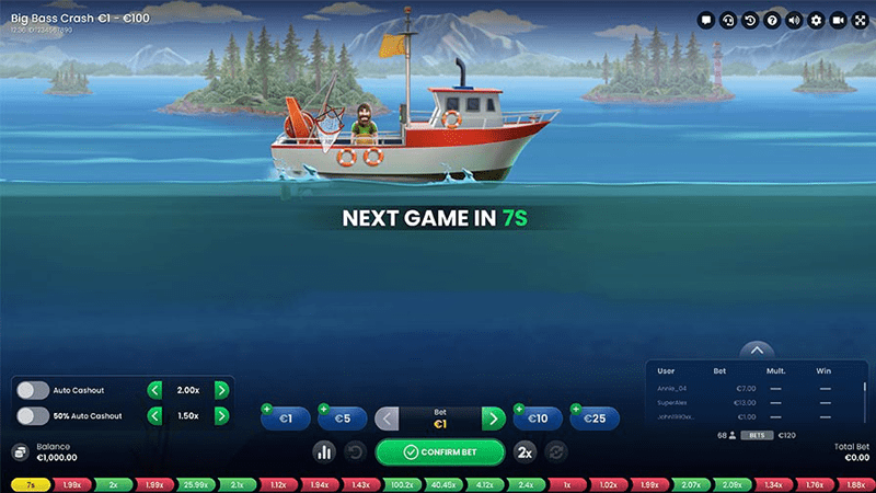 Big Bass Crash เป็นการรวมอยู่ในคอลเลกชั่นเกม Crash ของสตูดิโอใหม่ ในเกมนี้ คุณจะร่วมเดินทางไปกับชาวประมง Big Bass บนเรือของเขาในขณะที่เขาล่องเรือไปในน่านน้ำ แม้ว่าภาพอาจจะไม่ได้สวยงามที่สุดในการพนันออนไลน์ แต่มันก็มีความโดดเด่นเมื่อเทียบกับเกม Crash อื่น ๆ ไม่มีอะไรน่าตื่นเต้นหรือพิเศษในเกม ไม่มีสัญลักษณ์ ดังนั้นทั้งหมดจึงอยู่ที่การเลือกเดิมพันและหวังว่าจะได้รับเงินที่ดี