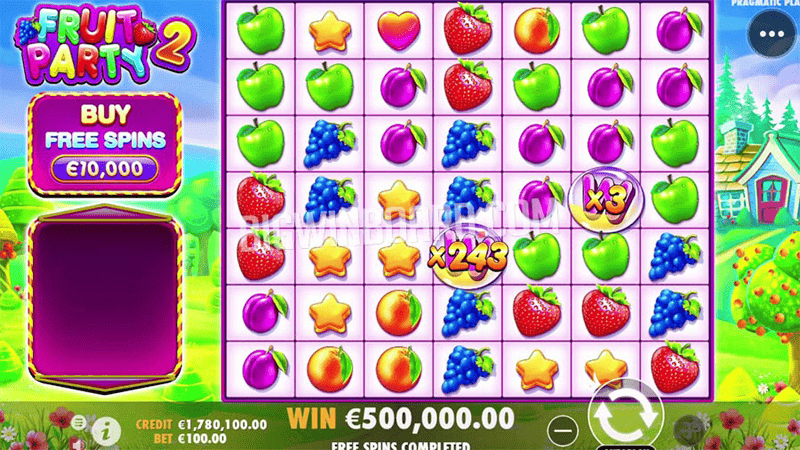 Fruit party 2 เกมสล็อตวิดีโอที่มีขนาด วงล้อ 7 รีล 7 แถว มีวิธีในการจ่ายเงินรางวัลแบบล็อคผลไม้ชนิดเดียวกันทั้งหมด เริ่มตั้งแต่ 5 ตัวขึ้นไป มีคุณสมบัติพิเศษของสัญลักษณ์ Wild ที่มีจะอัตราการคูณเงินรางวัลติดมาด้วยเริ่มต้นที่ 2x ไปจนถึงคูณ เงินรางวัลมากที่สุด 256x เท่า ในเกมหลักหรือ สัญลักษณ์ Wild ในฟีเจอร์ฟรีสปินก็จะมีการสุ่ม Wilds ลงบนวงล้อเหมือนเดิมแต่จะมีตัวคุณสูงที่สุดถึง 723x เท่าในแต่ละสัญลักษณ์ Wild โดยการสุ่มลงแต่ละครั้งก็จะสุ่มทั้งจุดที่ปรากฎและสุ่มอัตราการคูณ พร้อมคุณสมบัติการชนะรางวัลอย่าง Tumbling ภายในเกมสล็อตนี้ ที่จะช่วยให้ชนะเงินรางวัลได้อย่างต่อเนื่อง พร้อมค่าความผันผวนการออก เงินรางวัลถึง RTP: 96.53% และมีอัตราการจ่ายเงินรางวัลสูงที่สุดของ เกมถึง 5,000x เท่าของยอดเดิมพัน พร้อมความสนุกมากมายที่ภายในเกมได้เตรียมไว้ให้อย่างจุใจ
