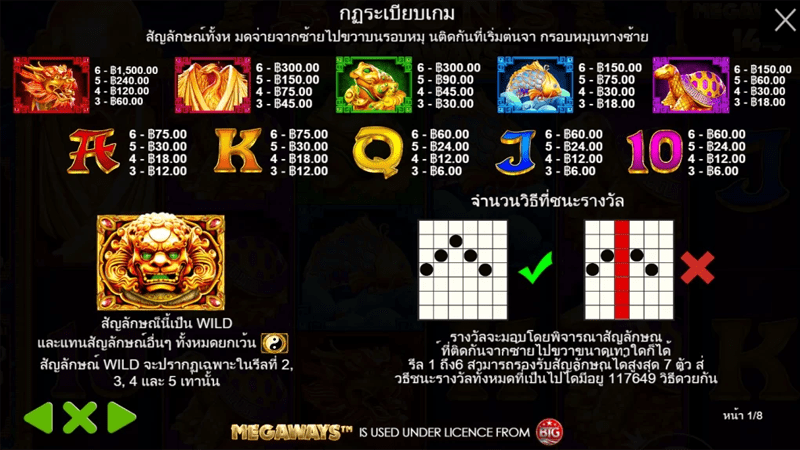 * 6 สปินฟรี พร้อมสุ่มตัวคูณ 15x , 30x หรือ 40x ตัวคูณ WILD 5 Lions Megaways สล็อตออนไลน์